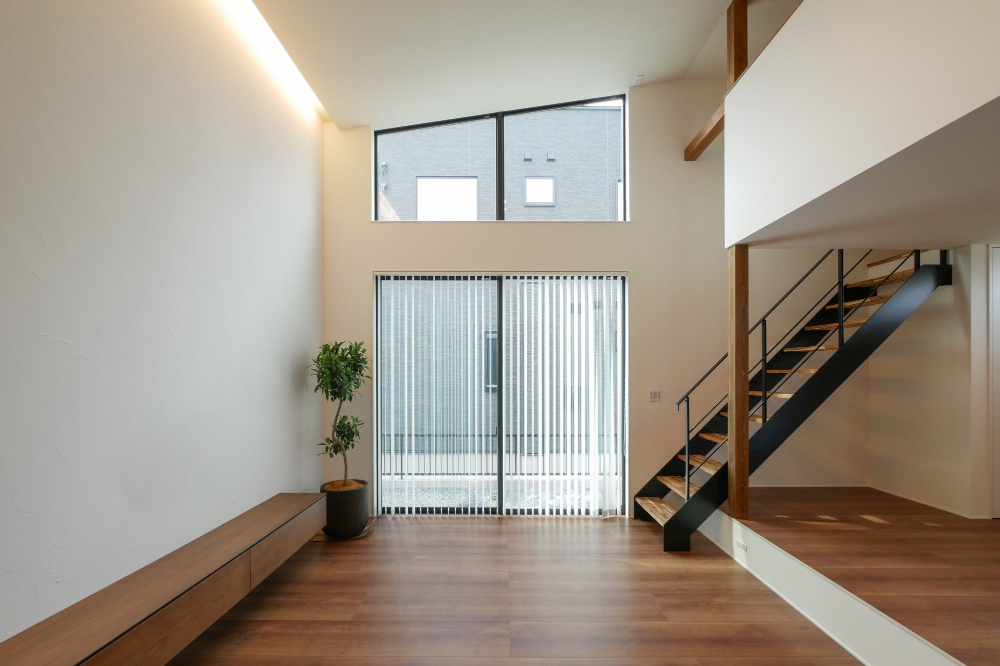 シースルー階段が空間に奥行きを生み、開放感をより一層引き立てます。 -