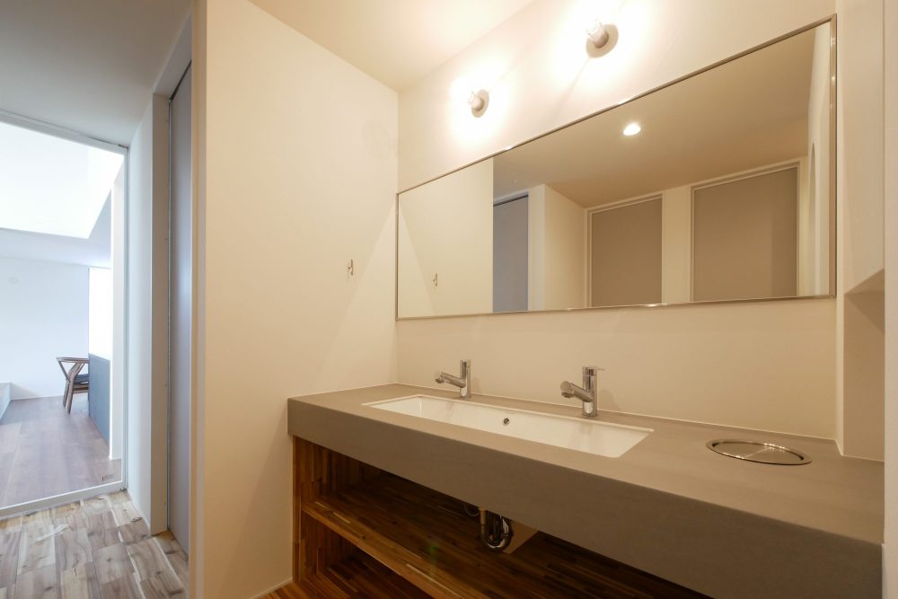 2つの水栓を備えた大きな鏡のダブル洗面で、家族の支度もスムーズに。 -