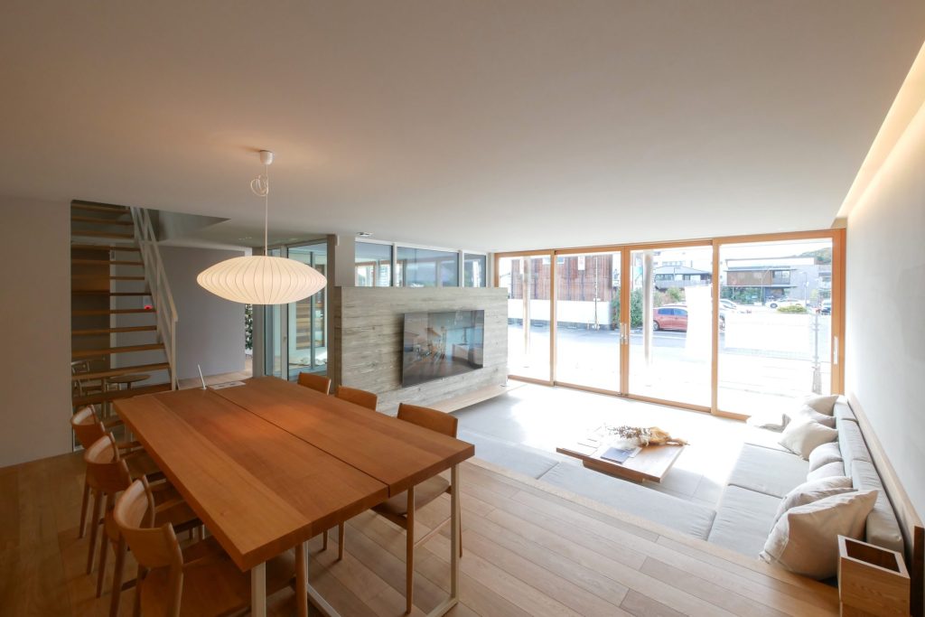 大開口の南面掃き出し窓をのぞむ土間リビングから、木のぬくもりを感じられるダイニングへと緩やかにつながる、大空間のLDK。