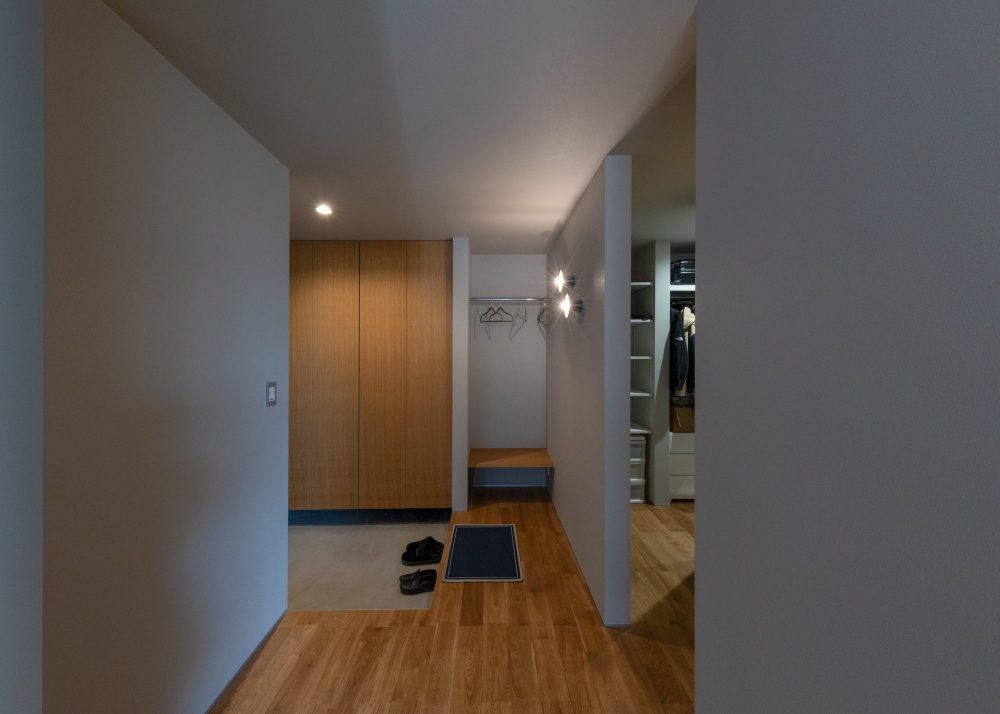 木目と間接照明が美しい、あたたかみのあるエントランスは、お家に入った瞬間、ほっと落ち着きを感じられます。