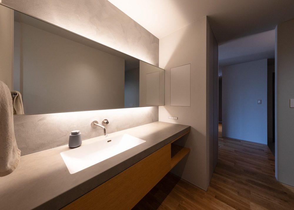 薄塗りコンクリートならではの表情をもつMPC塗装の壁に、間接照明の光が広がり、空間に美しい奥行きが生まれます。