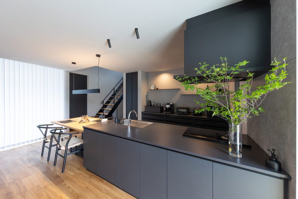「真っ黒のキッチンがいい」という夫婦の強い希望があり、マットな黒が特徴のクリナップのキッチンを採用しています。