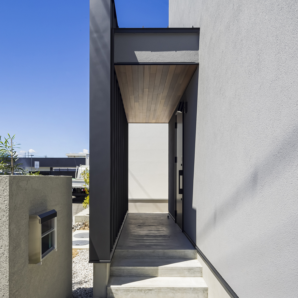 玄関ドアが近隣から目隠しされた住宅外観と、ご家族から見える玄関ドア・玄関ポーチの印象が異なるのが特徴的です。