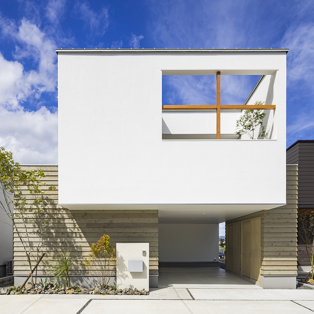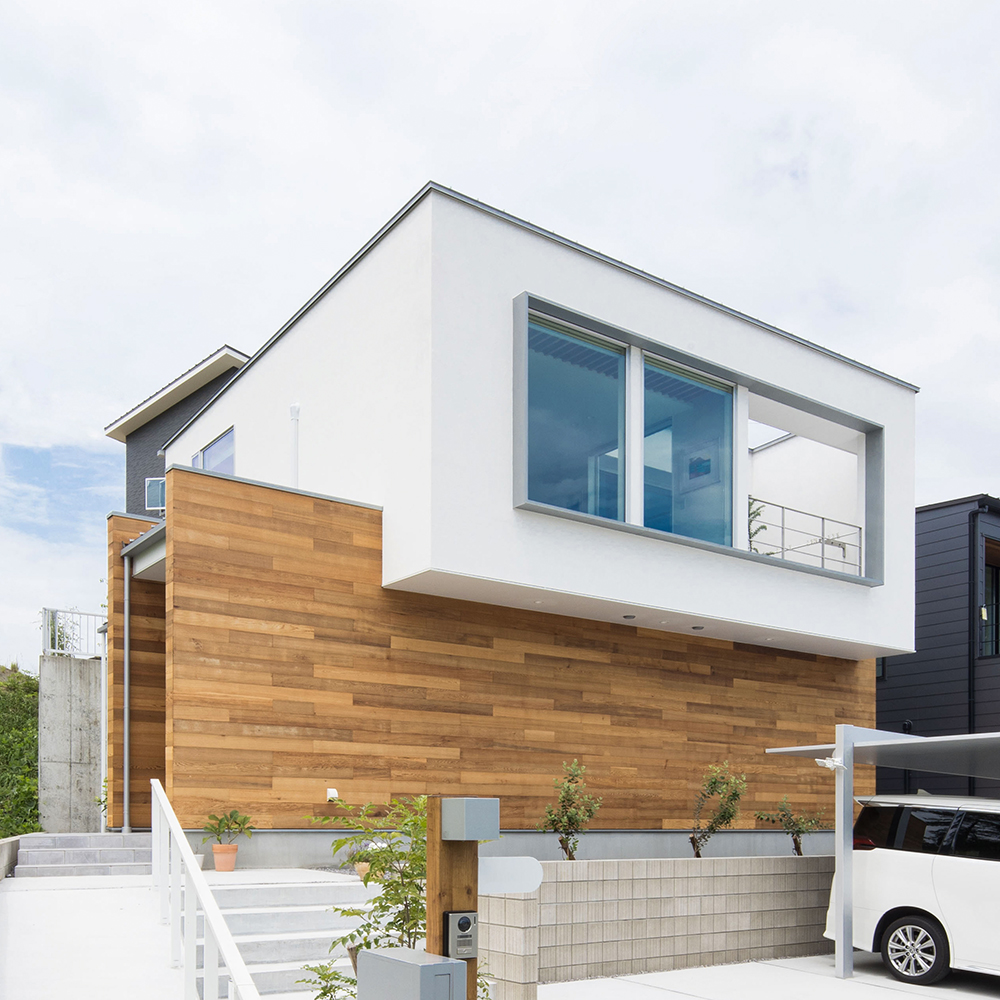 住宅外観 白い壁と木材がおしゃれな2階建て