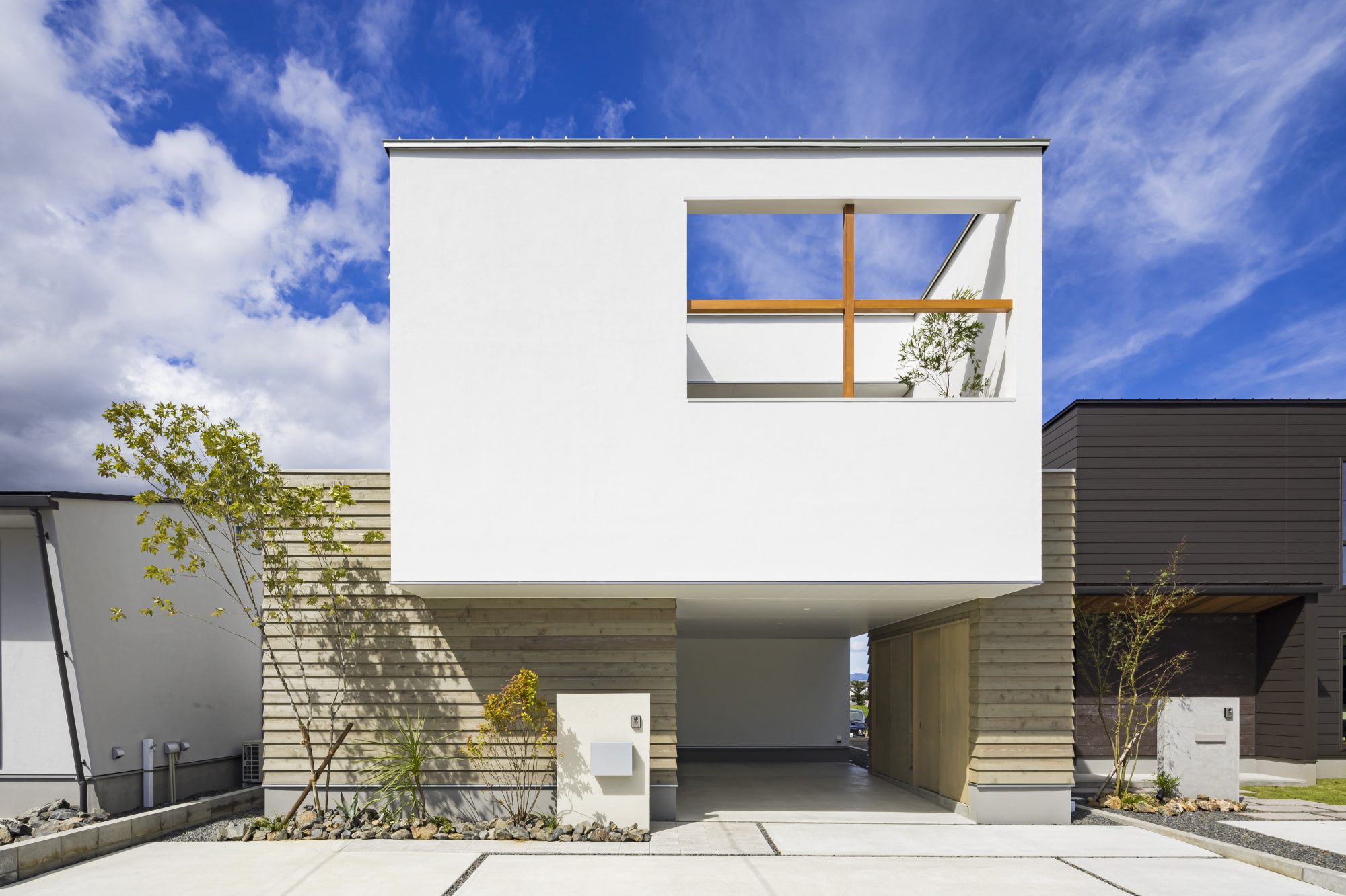 十字窓が印象的な外観のガレージハウス。白と木目を基調とした、シンプルで洗練された住空間になっています。