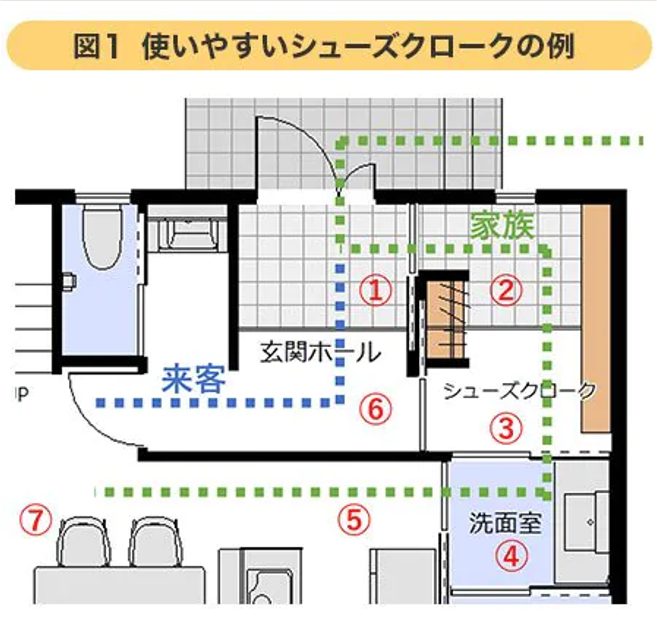 ・玄関近くに手洗い場やクローゼットを設けて、帰宅後すぐに手洗いやうがい、上着についた花粉を室内に持ち込まずに済む動線を作る。