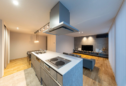 行き止まりのないアイランドキッチンを採用し、平屋ながらも圧倒的な開放感を実現。大きな窓から光が満ちる空間で、家族が自然と集まる広々としたLDKです。