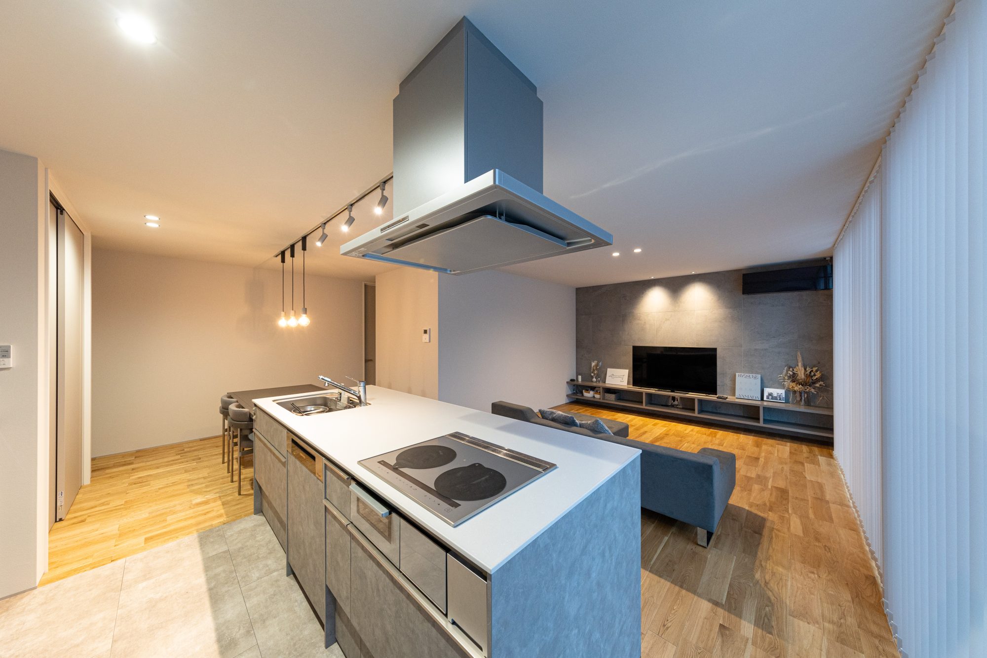 開放的な平屋で、「回遊できるアイランドキッチン」を採用。大きな窓から光が入り、家族が集う空間もゆったりと。