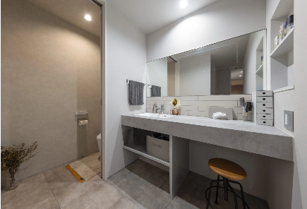 2人並んで使える大きな鏡と、パウダースペースを備えた充実の設えです。 -