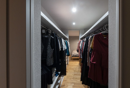 廊下をウォークインクローゼットに活用+ランドリールームから直行できるクローゼットという、暮らしやすさを意識した間取り。