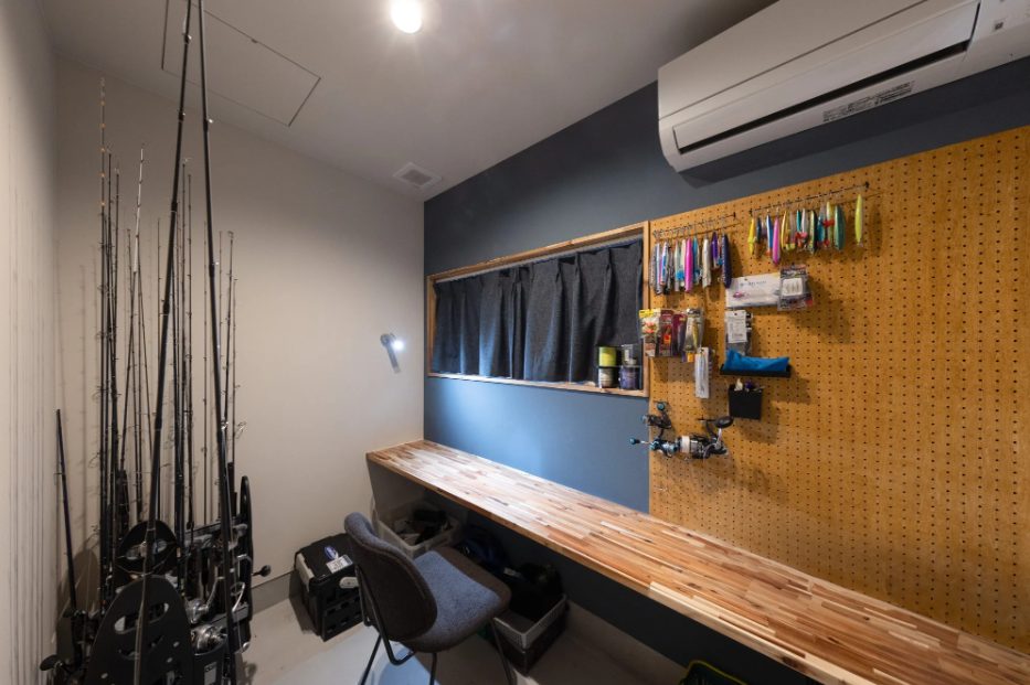 玄関から直行可能な造作カウンター&有孔ボード完備。「釣り具の整備・カスタム・ディスプレイ」を楽しむ趣味の時間も満喫できる秘密基地のような空間です。
