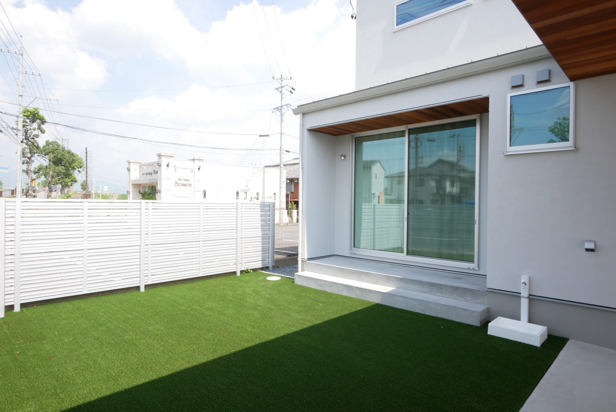 なるべくメンテナンスが掛からないものでかつデザイン性良くということで、シルバーの目隠しのアルミフェンスと人工芝。